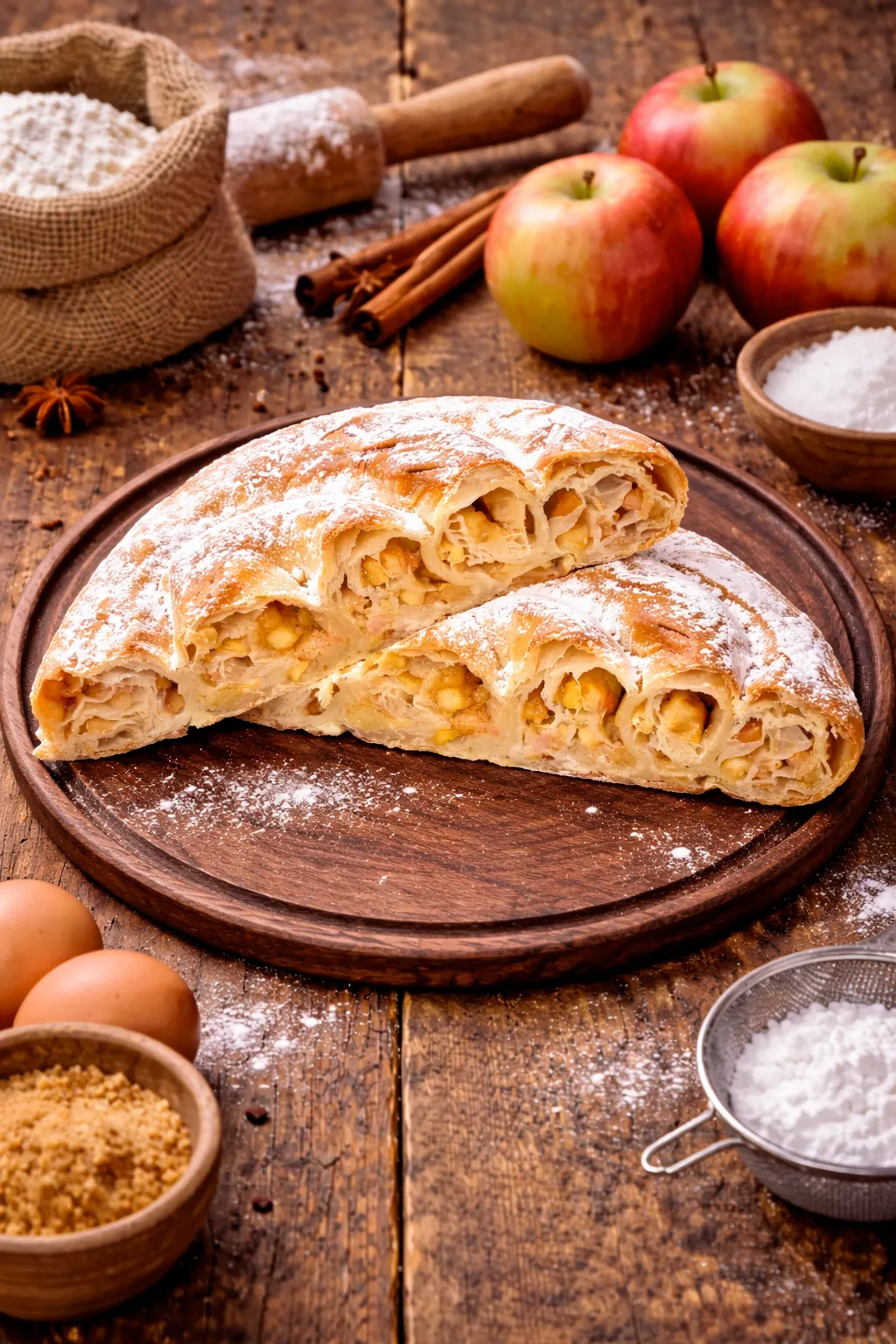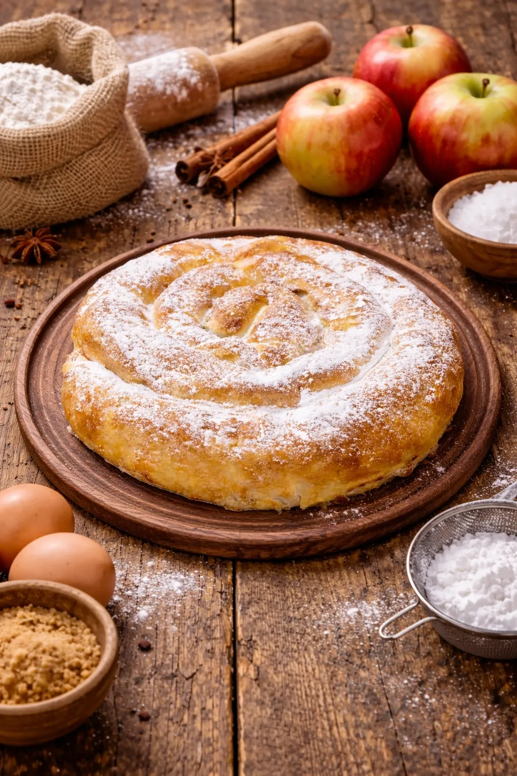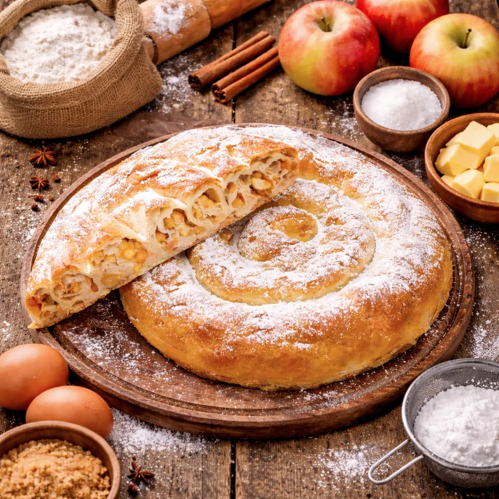 Plăcintă din aluat întins, cu mere proaspete, zahăr pudră.