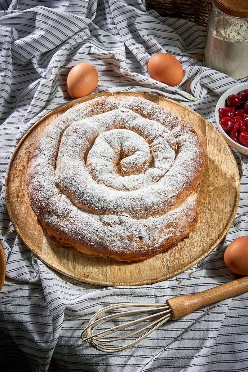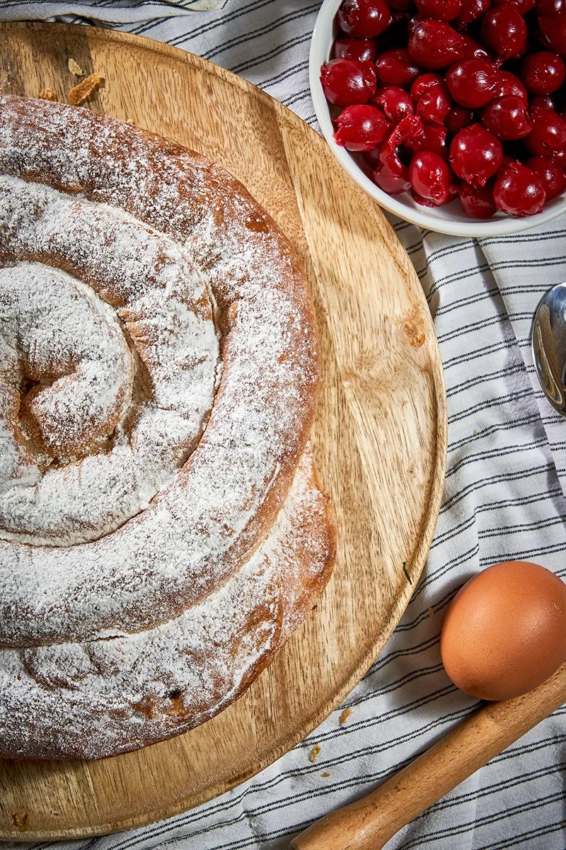 Plăcintă din aluat întins, cu vișină în suc propriu și zahăr pudră.