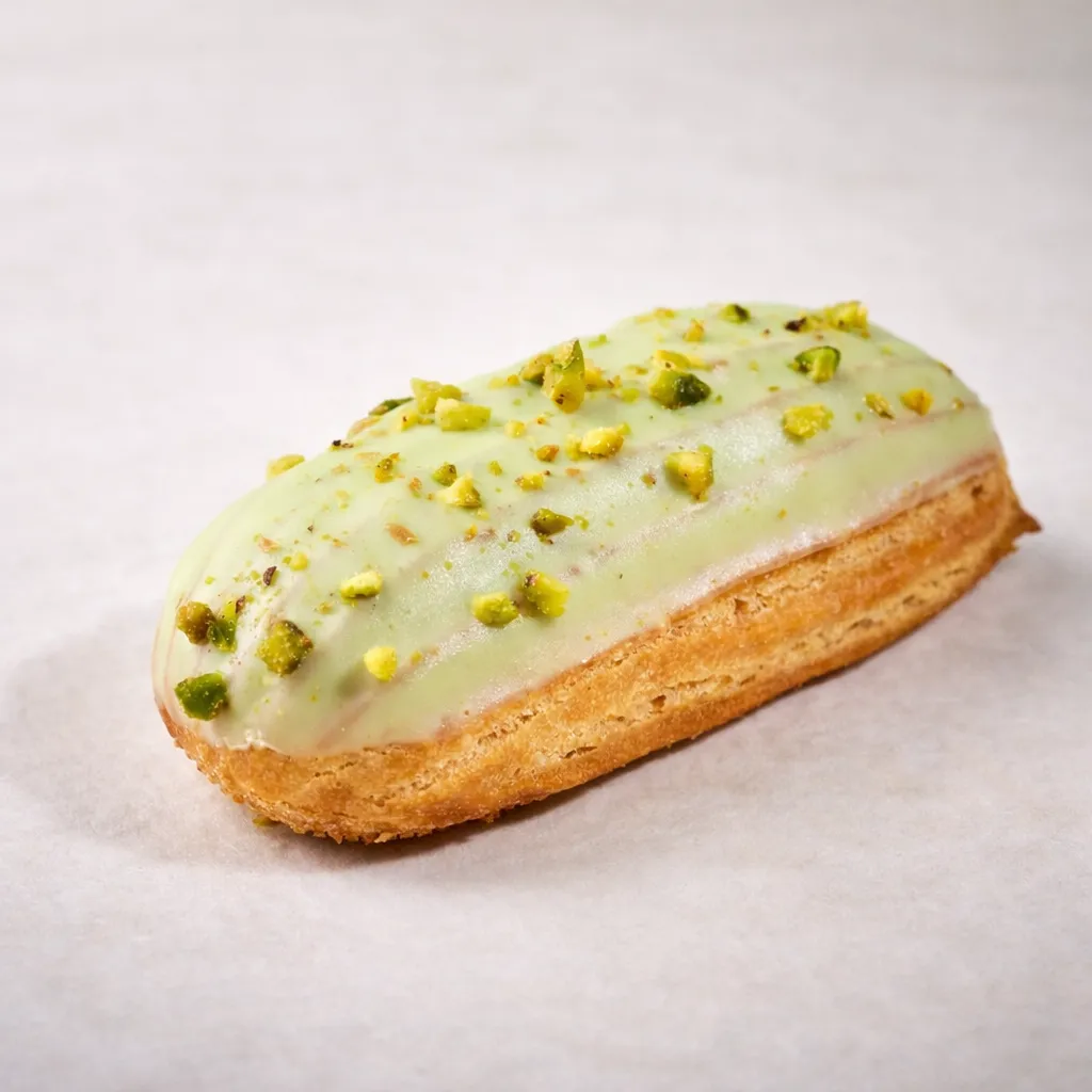 Пирожное из заварного теста с молочным кремом, фисташковой пастой, белым шоколадом и фисташками.