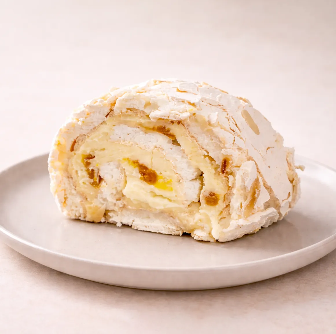 Рулет на основе безе, с кремом из сливочного сыра и белого шоколада с маслом 82,5%, начинкой из манго-маракуйи и миндальными хлопьями.